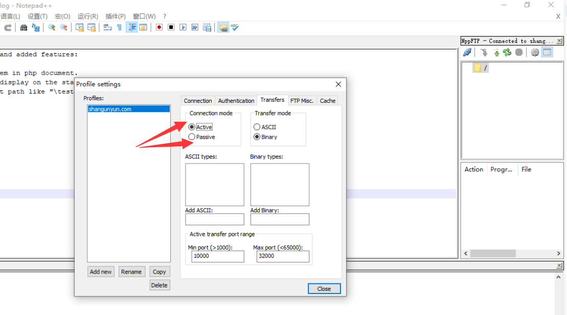 功夫不负有心人,最后终于发现,把Transfers下面的connection mode 从默认的passive修改成active,就能成功连接云服务器,而且我还发现,可以把多个云服务器的文件放在一起修改,修改完后保存的时候连接到不同的云服务器一个一个保存就可以批量修改多个云服务器上面相同的参数,而且可以直接查找替换,这样操作精确度高,效率高,错误率低,而且不会因为反复打开页面修改让人崩溃。
