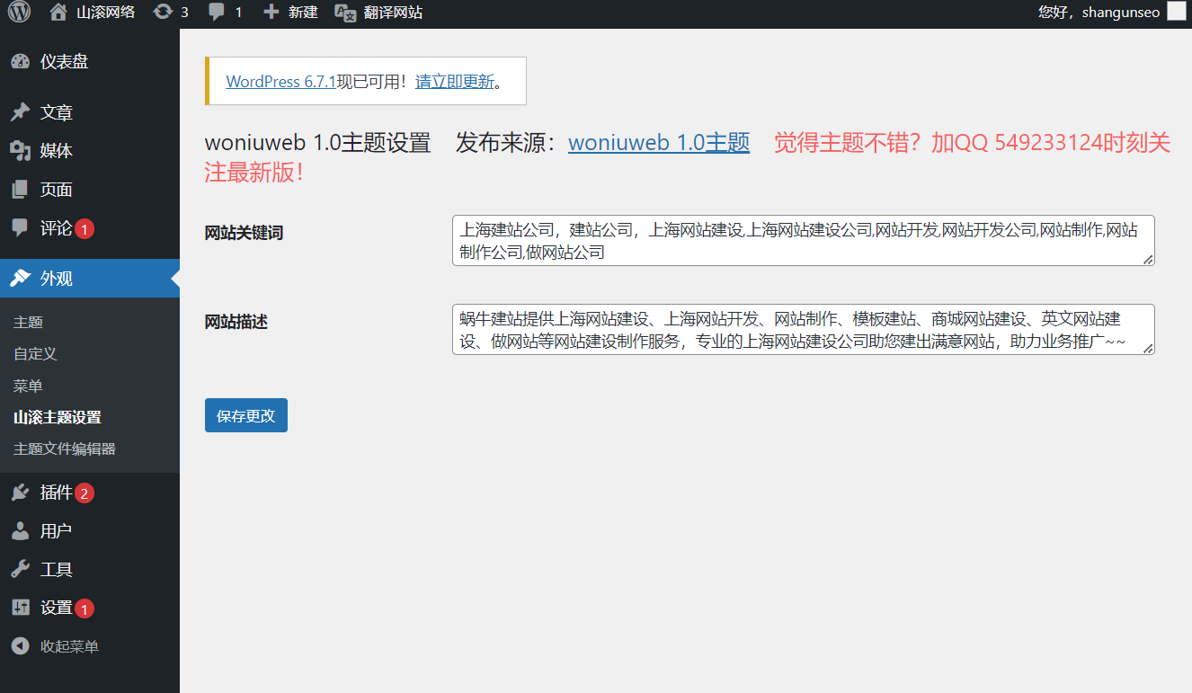 安装好Wordpress模板之后,可以在网站后台设置首页TKD。点击后台的“设置–常规”进行首页标题设置,“外观–山滚主题设置”对首页关键词、描述设置,在添加分类目录时/后进行分类目录TKD设置。