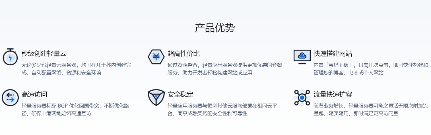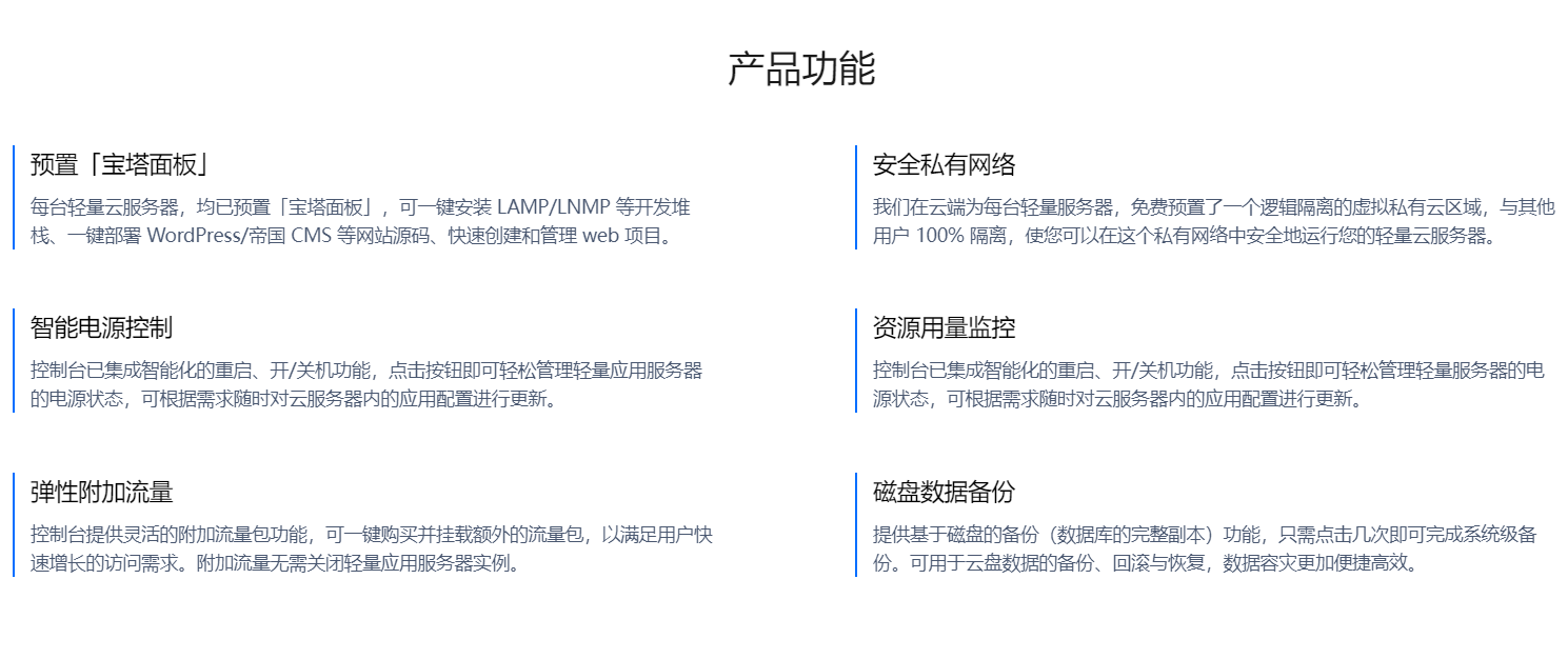 轻量云服务器,是操作简单、易于管理的轻量级云服务器,标配 BGP 优化高速带宽。预置主流「宝塔面板」,即使新手也可一键部署环境、搭建网站,实现运维监控和安全管理