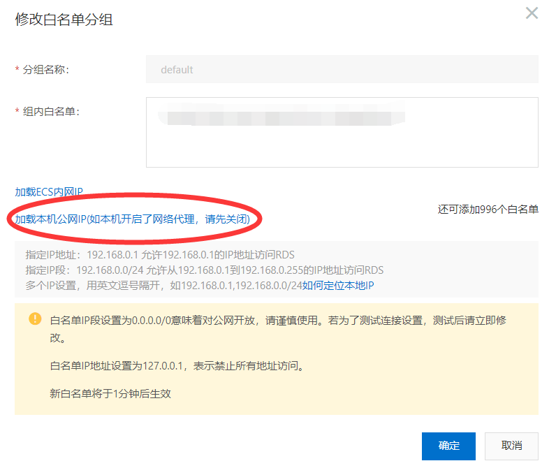 5、可以点击“加载本机公网IP”或者直接点击“白名单设置”按钮下方的“全部开发”允许所有IP地址连接RDSmysql数据库,