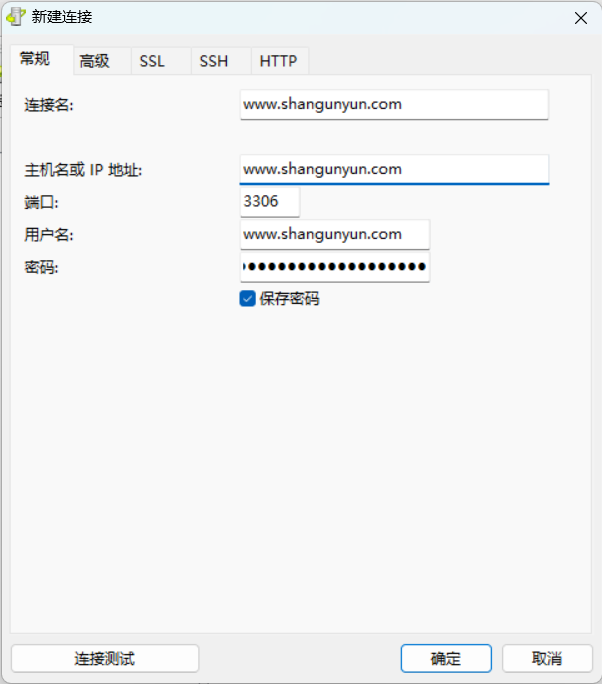 输入连接任意标识连接名称,输入数据库的外网链接地址,端口号,用户名,密码,