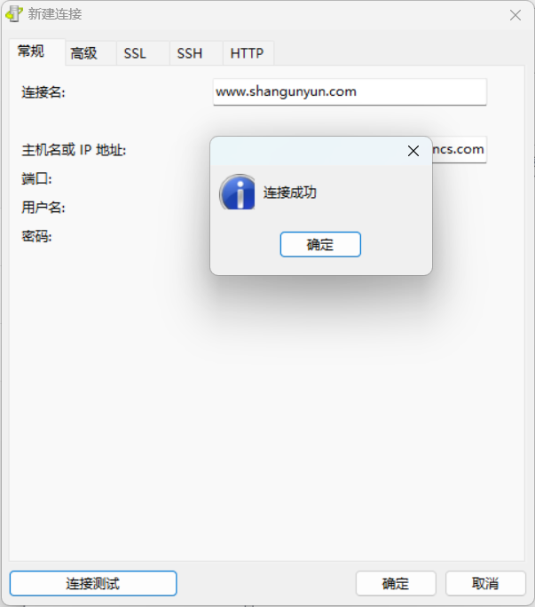 7、点击左下角的“连接测试”,只要以上信息填写正确,本地没有做代理或其它特殊设置,就可以连接成功了。点击右下角的“确定”保存连接。