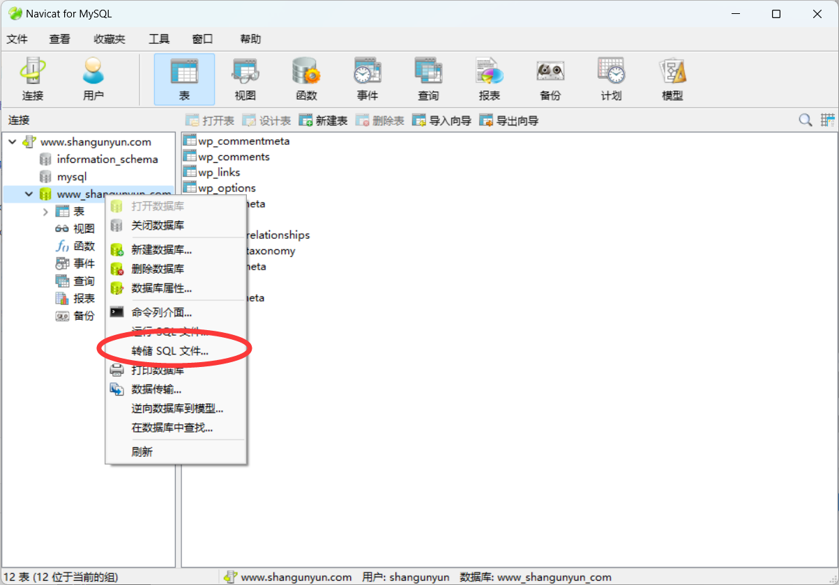 8、双击打开链接,右键点击数据库标识名称,点击“转储SQL文件…”即可把mysql保存到本地为常规格式的数据库文件,