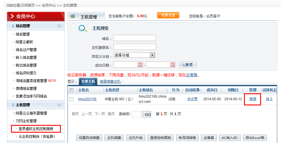 1. 在万网会员中心点击:登陆虚拟主机管理后台或点击                                               对应虚拟主机后面的“管理”-控制面板。