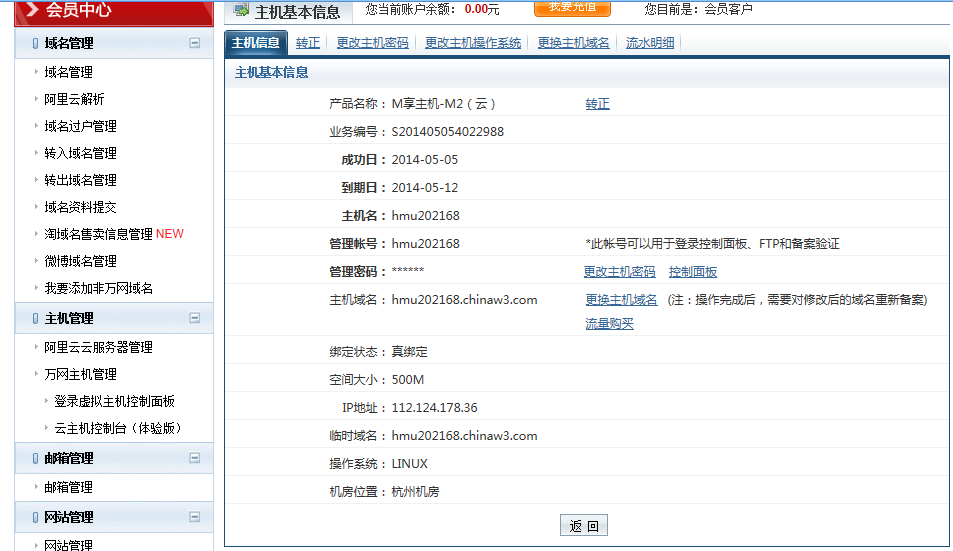 1. 输入管理帐号和密码,如果不知道自己的密码是多少,那么就在主机管理信息页,“管理密码”后面的“更改主机密码”修改密码,改完登陆即进入网站控制面板。