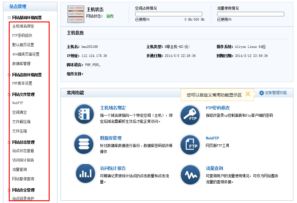 2. 登陆成功后,即可看到如下的界面,阿里云万网的空间功能是比较全的,所以我们需要用到的SEO功能全都有:FTP密码设置,默认首页设置,404页设置,数据库管理,文件压缩解压,站点状态,统计报告,流量 查询等。