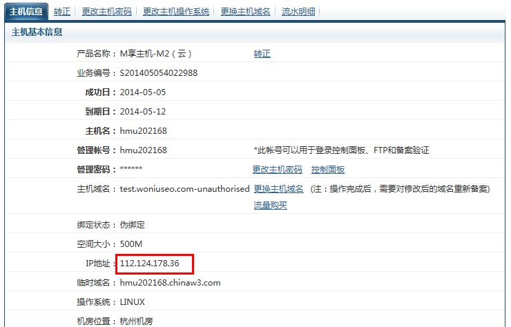 1. 回到主机管理界面,点击更换主域名。输入我们要绑定的域名:test.woniuseo.com,点击“下一步”,“提交”。