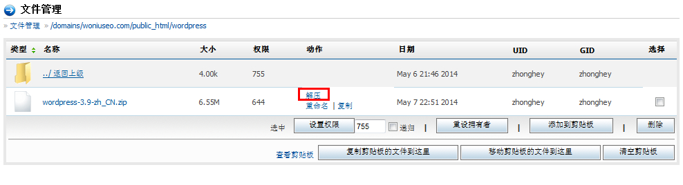3. 解压完成之后,把它通过FTP软件移动到网站根目录下面。(因为蜗牛是在自己博客的wordpress目录下面给大家演示的,因此,蜗牛就直接把它移动到wordpress目录下面。)