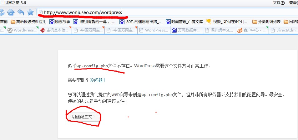系统榕提示,似乎Wp-config.php文件不存在,需要有这个文件才能工作。这是网站的配置文件,所以不存在我们就得创建它。点击:创建配置文件。
