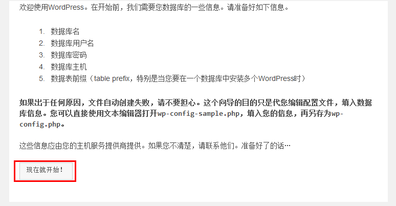 1. 提示我们需要数据库信息,点击下面的“现在就开始!”