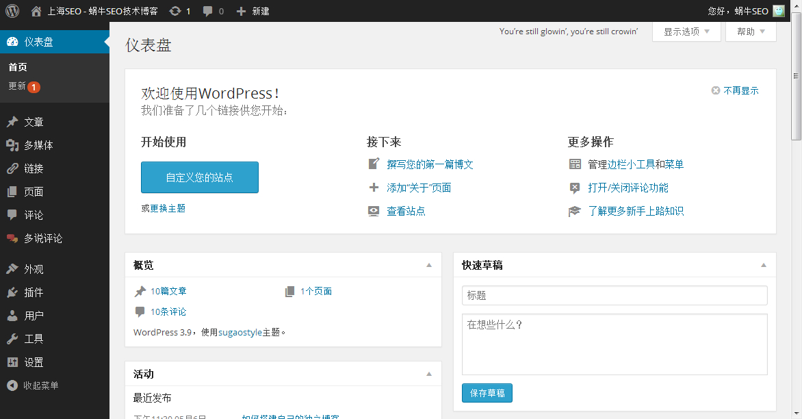 WP的后台就是这样的。后台仪表盘默认由:首页,文章,多媒体,链接,页面,评论,外观,插件,用户,工具,设置十一项构成。(首页下面的更新是WP的更新提示,无法隐藏,如果想要更新,可以进行更新操作。另第三方有隐藏更新提示的相关方法)