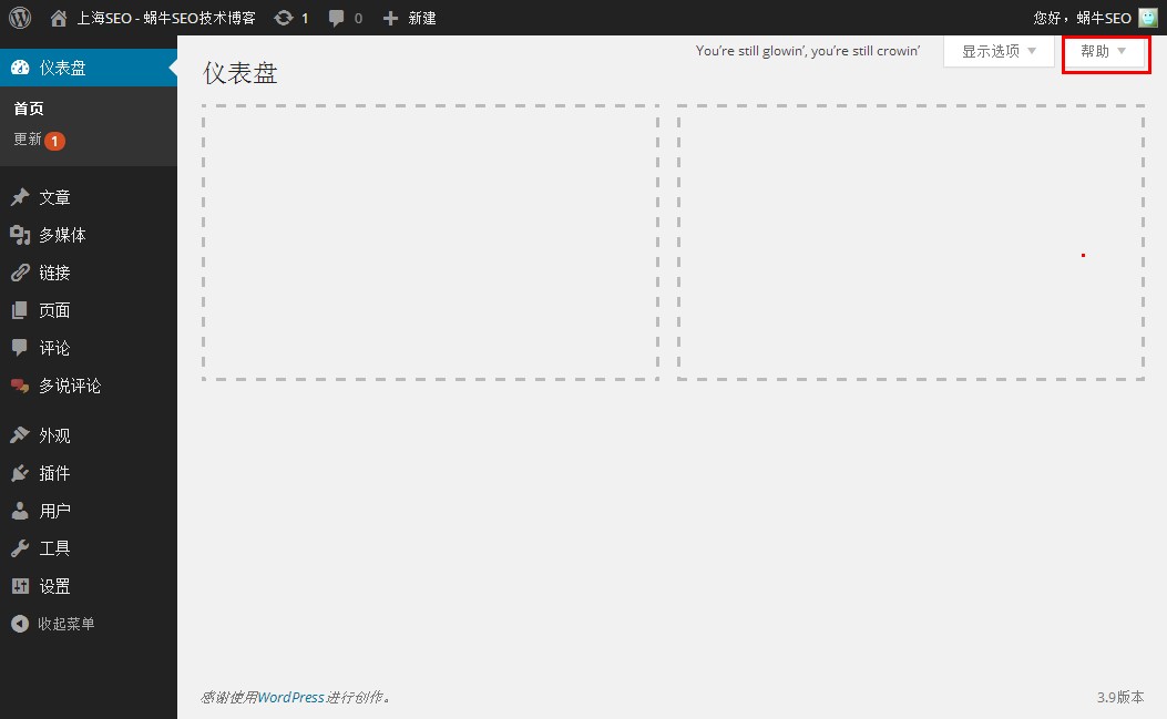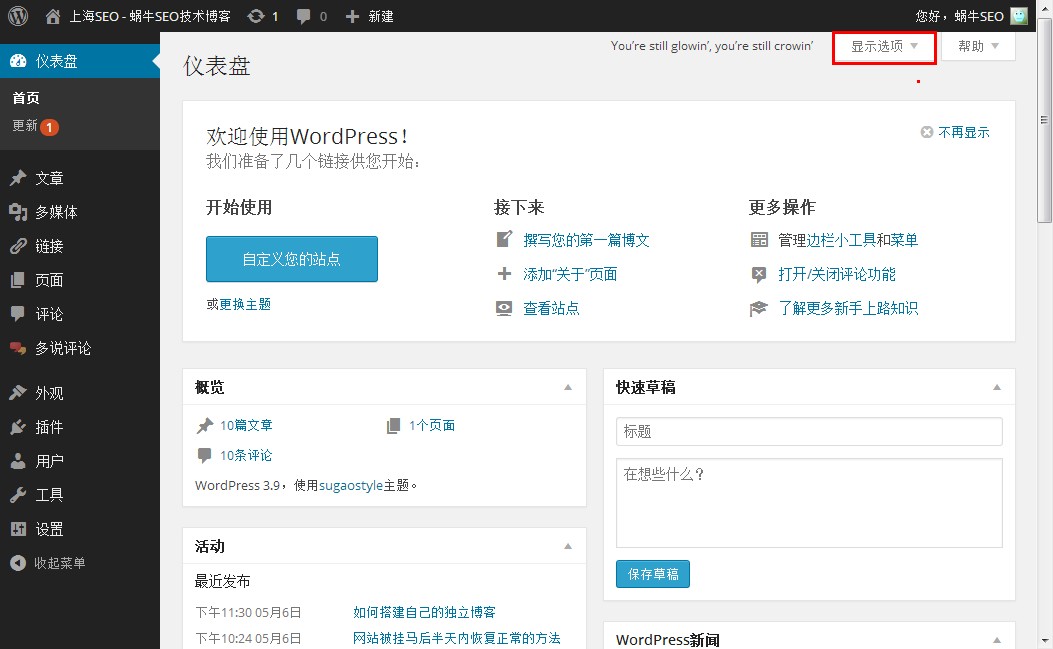 可以在后台首页“显示选项”选择你想要在后台显示和不想要显示的项目。如下图,把所有项目都隐藏掉,后台首页就变得空荡荡得了。相信有些朋友用过几个月甚至几年都不知道有这功能吧。右边还有个“帮助”呢。帮助,是什么内容,建议大家最好去看看,蜗牛就不在这里细说了。