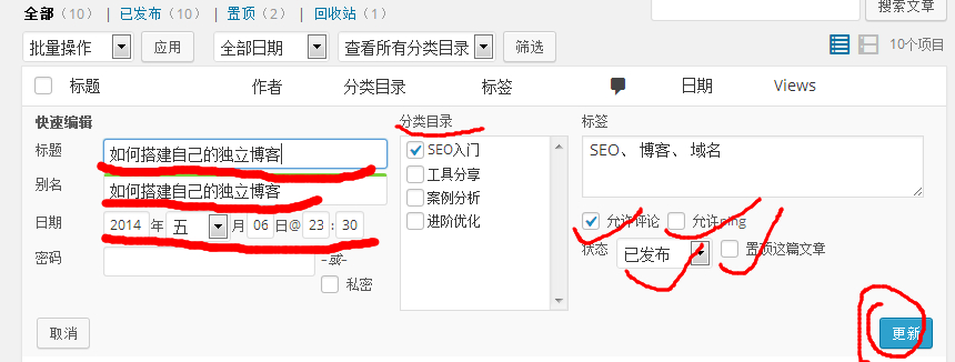 点击文章下面的“快速编辑”,可以修改标题,文章别名,发布日期,加密或设为私密,修改分类目录,修改标签,是否允许评论,是否允许ping,发布状态,是否置顶。(嘿嘿,是不是激动了,是不是很多东西,你都没有用过,都不知道呢,是不是好奇怪别人的博客怎么就能置顶了呢,自己的怎么就不能了呢?别瞎想了,蜗牛花那么多时间深更半夜写那么多内容,就是让你瞎想的吗?赶快实际操作吧,赶快往下看吧,别浪费时间了。)