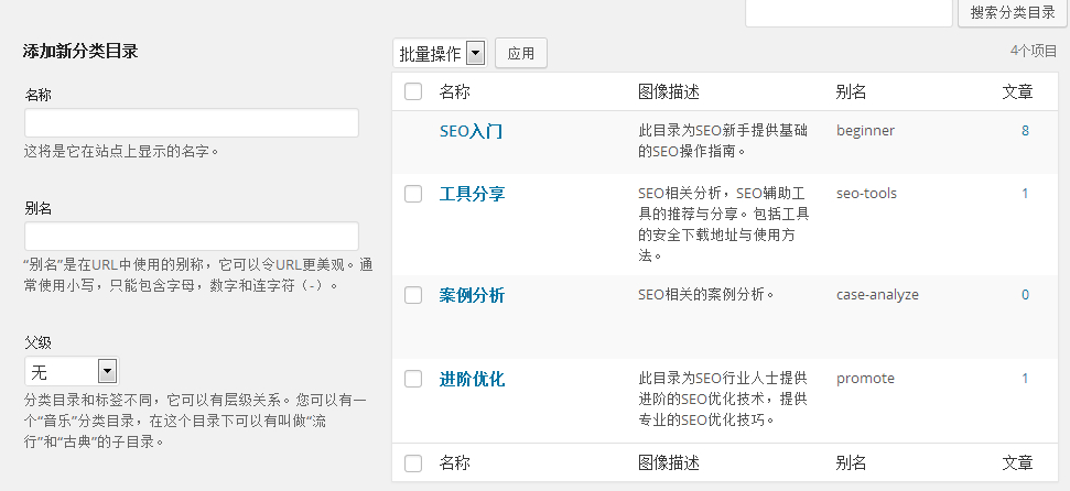 是添加到你菜单上面的分类,名称就是显示名。别名是用来显示在网址上面的,如果是中文,显示出来会是乱码,建议用拼音或是英文。描述,就说一下你这个目录里面是用来放什么东东的就可以了。