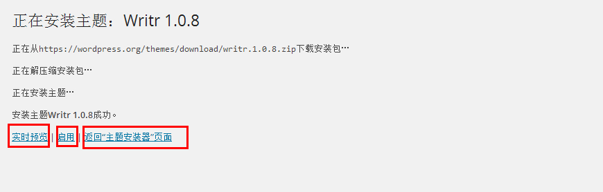 在主题界面,我们点击顶部的“添加”,即可“上传主题”。或者从Wordpress官方提供的一些主题中通过不同的条件,选择出我们喜欢的主题,点击“预览”或“安装”即可预览或安装主题。安装成功主题之后,会提示如下图“正在解压,安装主题,主题安装成功。