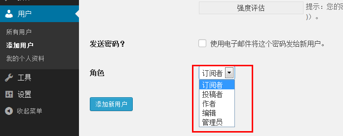用户菜单,是用来管理用户的,可以添加删除用户或是管理员,订阅者等。