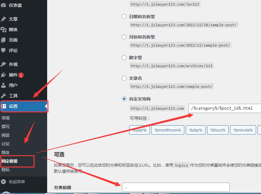 “设置”下面的“固定链接”下面设置好伪静态规则,一般大家常用的是:
